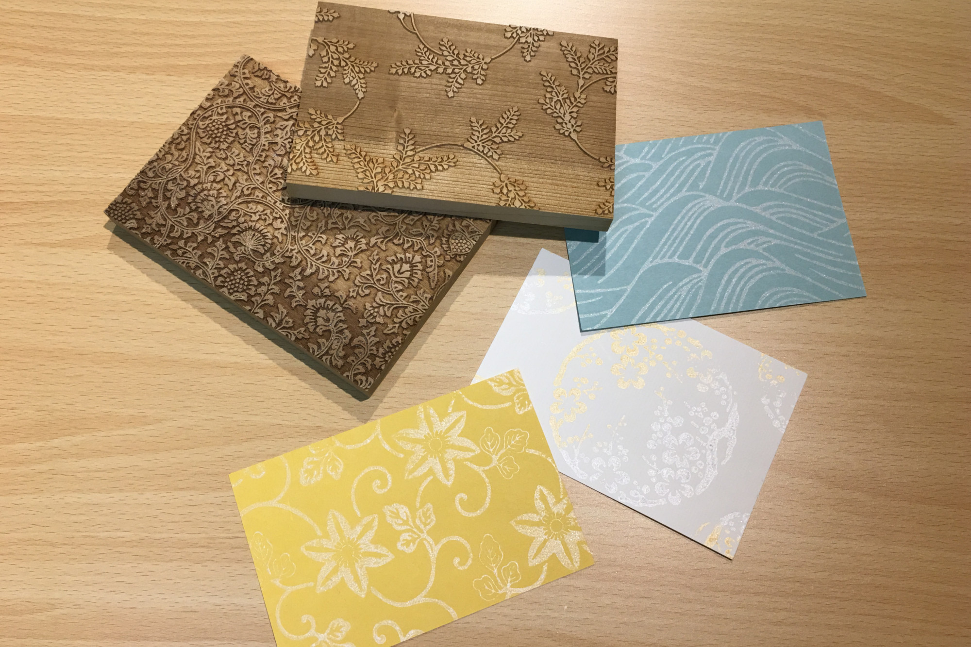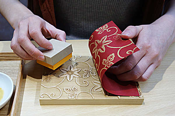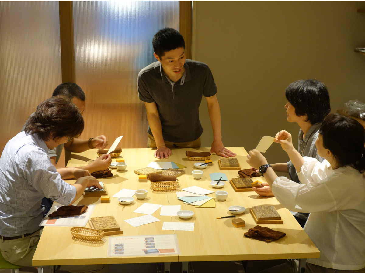 There is a hands-on workshop where visitors can experience Kyo-karakami by using real woodblocks, a gift store where wooden stamps with woodblock motifs and interior products finished with karakami are available.