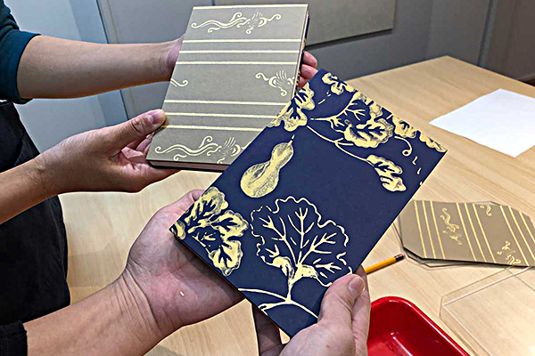 Making red seal impression books at "Karamaru" in Kyoto